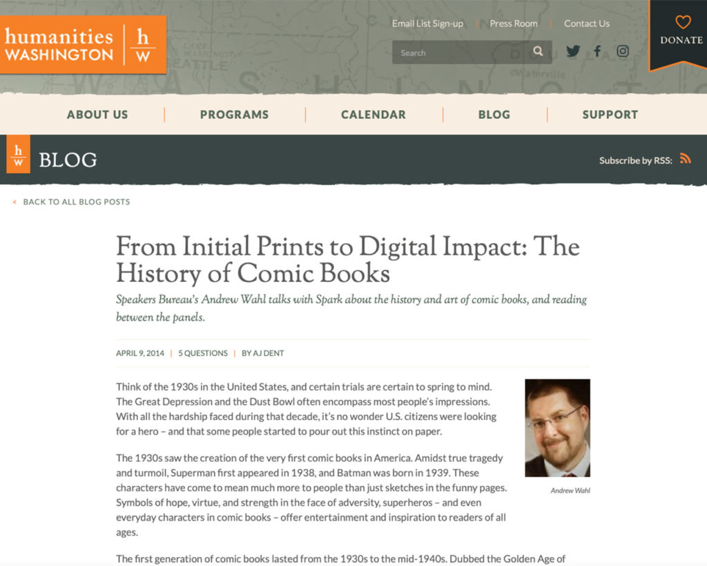 Over the past eight years, comics-studies scholar T. Andrew Wahl traveled more than 10,000 miles talking about comic books, superheroes and U.S. history as part of the Humanities Washington Speakers Bureau. But his current talk – “Comic-Book Reality: Superheroes and the Power of Representation” – closes its run in a virtual space with three free Zoom presentations this month.