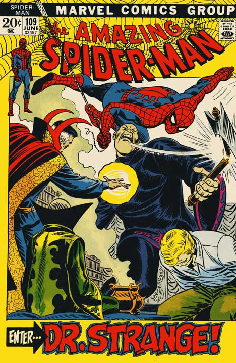 Review: Spider-Man teams with Dr. Strange! Vengeful Asian monks! Social relevance (i.e., Vietnam and interracial romance)! Relationship angst! And, best of all, Gwen Stacy giving Aunt May a verbal smackdown! That’s a lot of comic book for 20¢! (Sorry for all the exclamation points, but this is a Stan Lee comic, after all!) Spider-Man #109 is a quintessential example of an early ’70s Spider-Man outing. Lee piles conflict after conflict onto Peter Parker’s life. Melodramatic? Yes, but it sucks the reader right into Spidey’s crazy world. Add strong, clean art from John Romita, and this is one enjoyable comic.