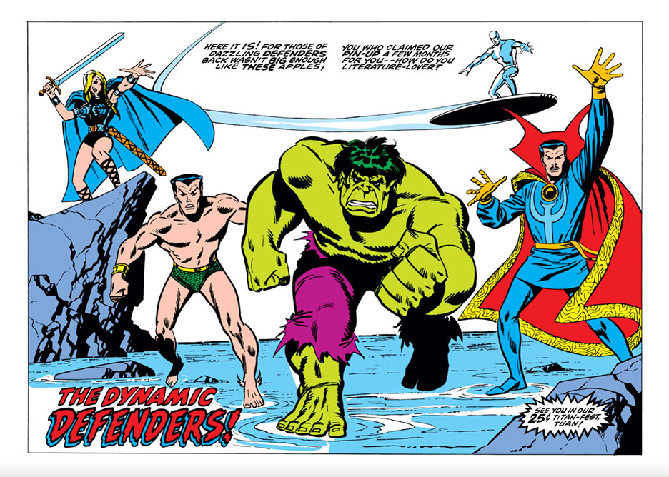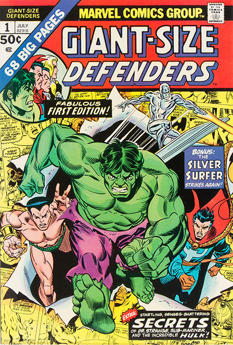 Notable: Reprints material from Incredible Hulk #3, Sub-Mariner Comics #41, Stange Tales #145 and Fantastic Four Annual #5. … Also includes a two-page pinup of the Defenders by Sal Buscema.