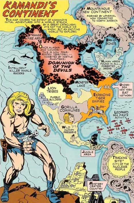 Cool factor: While derivative, Kirby set loose in a “Planet-of-the-Apes”-like future is not a bad thing! The map of “Kamandi’s Continent” promises future adventures in the “Dominion of the Devils,” the “Undersea New York Rat Network,” and the “Wild Human Preserve.” This reviewer is so there!