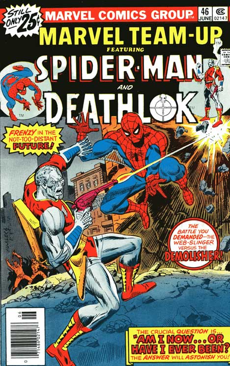 Review: Marvel Team-Up’s half-year-long time-travel storyline wraps up with another done-in-one tale. While the Salem issues of this storyline (see reviews of MTU #41, #42, #43 and #44) were well conceived and executed, both this issue and MTU #45 have the feel of tacked-on afterthoughts. Still, it’s always nice to visit the future of Deathlok, one of Marvel’s more richly rendered dystopian futures. Bill Mantlo and Sal Buscema do a serviceable job, but this issue makes it clear just how important Rich Buckler was to the overall “feel” of his cyborg creation. Sadly, Buckler just provides the cover here.
