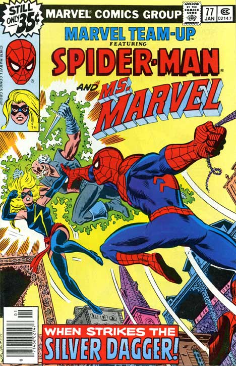 Review: The second half of a two-part tale (see review of part one), this installment falls apart under its own weight. Already laden with characters, the story is further bogged down by the return of an old Doctor Strange villain, the Silver Dagger. The supporting cast seems out of place in this mystic adventure, with Ms. Marvel feeling particularly misused. And, for a second issue, Howard Chaykin’s contributions are all but lost under the other artists’ work. All in all, not the best issue of Marvel Team-Up.