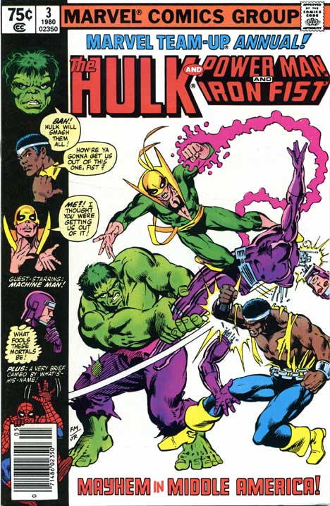 Review: This annual isn’t nearly as strong as it should be. The main reason is that its heroes, at this point in their careers, lack compelling character motivations. Power Man and Iron Fist are super-powered rent-a-cops. Machine Man is working as a claims adjuster. And the Hulk wanders from place to place being tricked by one human after another. Writer Roger Stern puts these characters through their paces, but it’s just hard to care. And the story doesn’t get much help from penciler Herb Trimpe, an acquired taste this reviewer has never quite acquired.