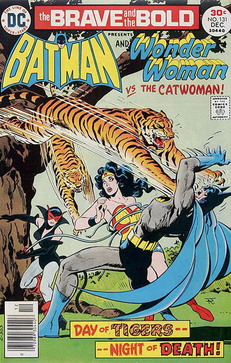 Review: Bob Haney’s work on Brave & the Bold is always a bit hit or miss, and this isn’t one of his stronger outings. A weak spy thriller, the story teams Batman and Wonder Woman in a convoluted plot involving Catwoman and a fictional stand-in for then-oft-in-the-news Libya. The characterization is largely interchangeable and the plot lurches to and fro with little realism or attention to story logic. On the upside, Haney’s wackadoodle scripts always provide master Bat-artist Jim Aparo with plenty of cool things to draw. From jungle cats to DC’s favorite Amazon, Aparo turns in a fine job as usual.