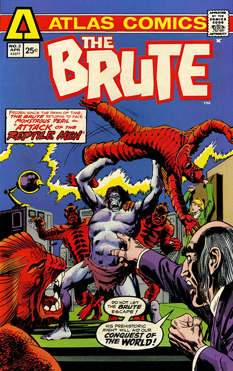 Review: After a lackluster debut (see review), the Brute’s second outing isn’t much better. Atlas’ blue, prehistoric answer to the Hulk doesn’t bring much unique to the mix beyond writer Michael Fleisher’s penchant for gruesome violence, and even those scenes lack his usual creativity. The mad scientist villain is an off-the-shelf model from B-movie central casting, while the reptile men could have been in any ’50s horror comic. And these generic elements aren’t even remixed in a new or novel way. At least Mike Sekowsky’s art is more consistent this time out.