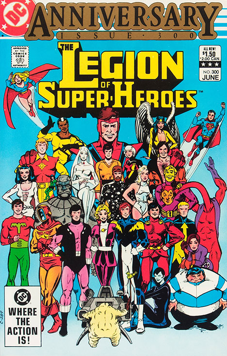Notable: According to the Grand Comics Database, this issue’s jam cover was drawn by Carmine Infantino and Bob Oksner (Supergirl), Paris Cullins (Invisible Kid), George Pérez (Colossal Boy), Joe Kubert (Dawnstar), Kurt Schaffenberger (Superboy), José Luis García-López (Sun Boy), Don Heck (White Witch), Jim Aparo (Karate Kid), Jan Duursema (Queen Projectra), Gene Colan and Frank Giacoia (Timber Wolf), Dave Cockrum (Phantom Girl), Walter Simonson (Blok), George Tuska and Mike DeCarlo (Star Boy), James Sherman (Dream Girl), Howard Chaykin (Brainiac 5), Curt Swan (Ultra Boy), Howard Bender and Dave Hunt (Wildfire), Keith Giffen and Larry Mahlstedt (Cosmic Boy), Dick Giordano (Saturn Girl), Mahlstedt and Giffen (Lightning Lad), Gil Kane (Mon-El), Trevor Von Eeden (Element Lad), Joe Orlando (Chameleon Boy), Ross Andru and Romeo Tanghal (Shadow Lass), Ernie Colón (Duo Damsel), Joe Staton (Bouncing Boy), and Giffen and Dan Adkins (Proty II).