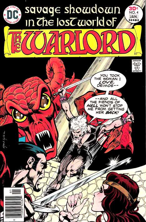 Review: The conclusion of the first Deimos arc ends with a bang (and a sword fight). By today’s standards, this storyline feels a bit rushed, but that’s certainly better than dragging it out over several “decompressed” issues. While most of Warlord #4 works, Morgan’s showdown with Deimos doesn’t ring true. Why would a powerful sorcerer fight the Warlord with blades? What does work well are the continued hints of forgotten advanced technology from Skartaris’ past; it’ll be interesting to see how this develops. As for the art, Grell’s inking is starting to get a little scratchy, especially the shading.