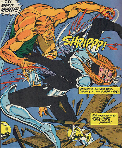 Character quotable: “He’s got more guts than I thought, but I’d rather not look at them all over the floor!” – Tigorr, mixing apropos pun and backhanded compliment with aplomb
